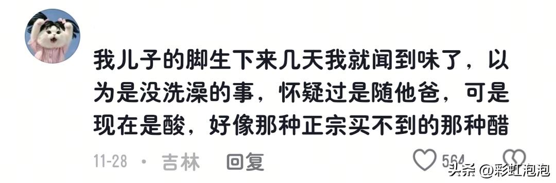 “我女儿就是,才6个月的时候闻了一下她的脚,有淡淡的脚臭味,我都震惊了,还不会走路,鞋都没穿过的宝宝,怎么就有脚臭呢,现在8岁多了,脚更臭了,就是随爸,但是她爸也没那么臭啊!”,一位网友评论道。